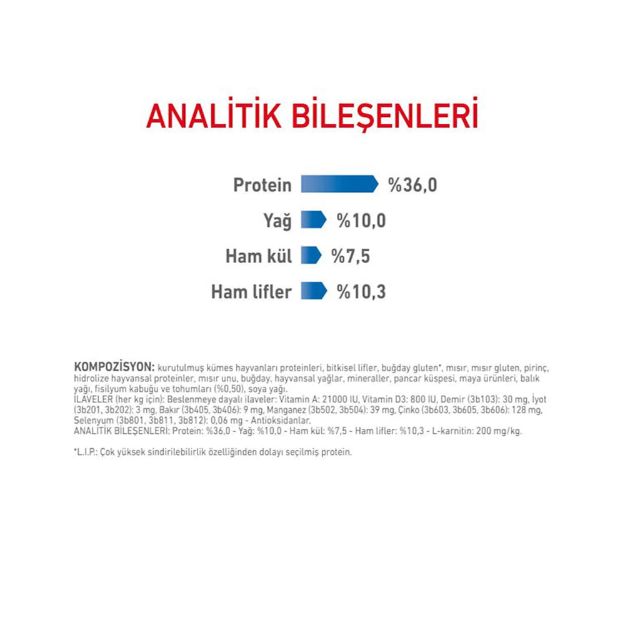 nbsp;Protein : %36, Yağ : %10, Ham Kül : %7.5, Ham Lifler : %10.3, L-Karnitin: 200 mg/kg.