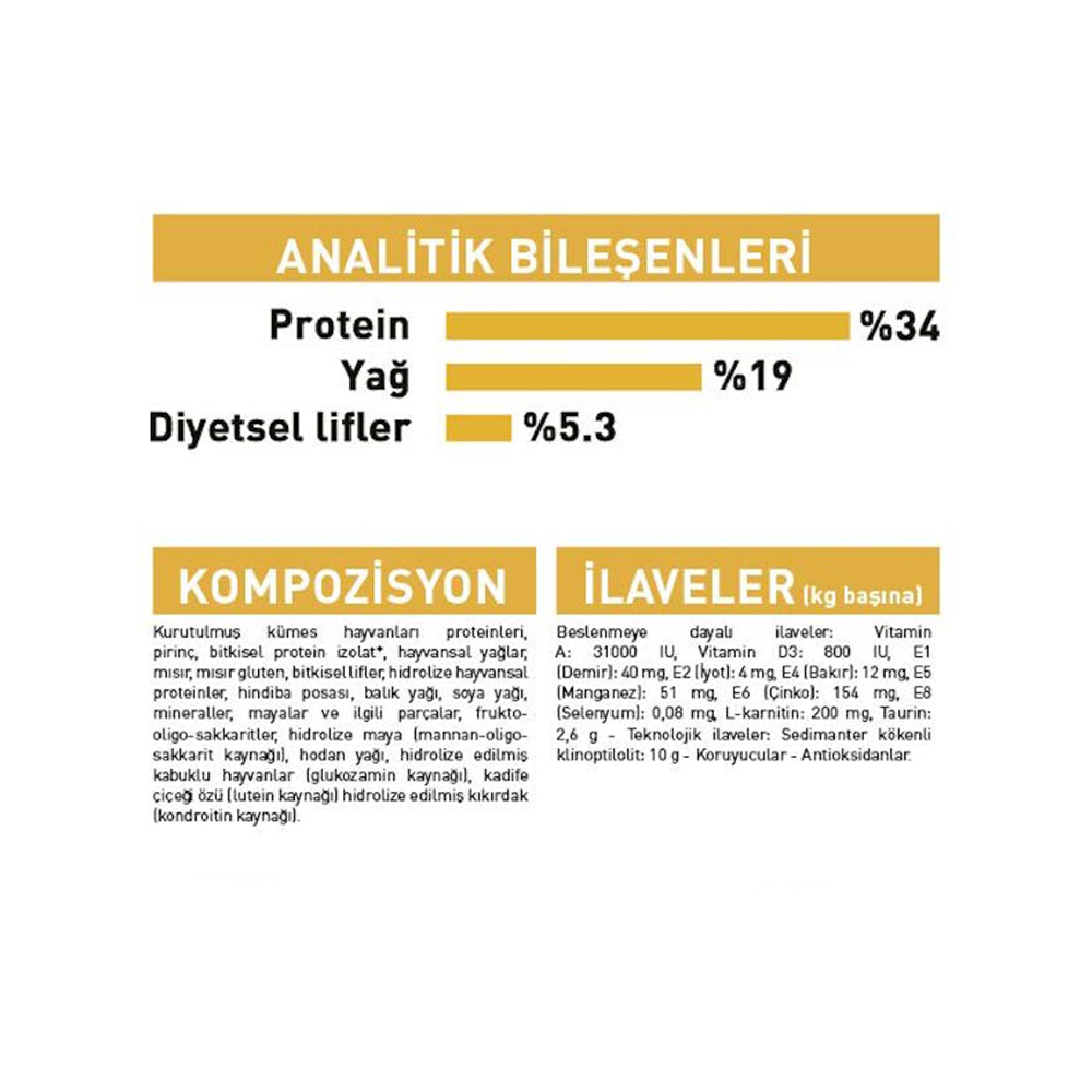 kurutulmuş kümes hayvanları proteinleri, pirinç, bitkisel protein izolat*, hayvansal yağlar, mısır, mısır gluten, bitkisel lifler, hidrolize hayvansal proteinler, hindiba posası, balık yağı, soya yağı, mineraller, mayalar ve ilgili parçalar, frukto-oligo-sakkaritler, hidrolize maya (mannan-oligo-sakkarit kaynağı), hodan yağı, hidrolize edilmiş kabuklu hayvanlar (glukozamin kaynağı), kadife çiçeği özü (lutein kaynağı), hidrolize edilmiş kıkırdak (kondroitin kaynağı).