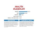 ANALİTİK BİLEŞENLERİ: Protein: %31.0, Yağ: %20.0, Ham kül: %8.0, Ham lifler: %1.4, Omega-3 yağ asidi (DHA): %0.17, Vitamin E: 500 mg/kg, Vitamin C: 400 mg/kg. Metabolize edilebilir enerji: 4072 kcal/kg.